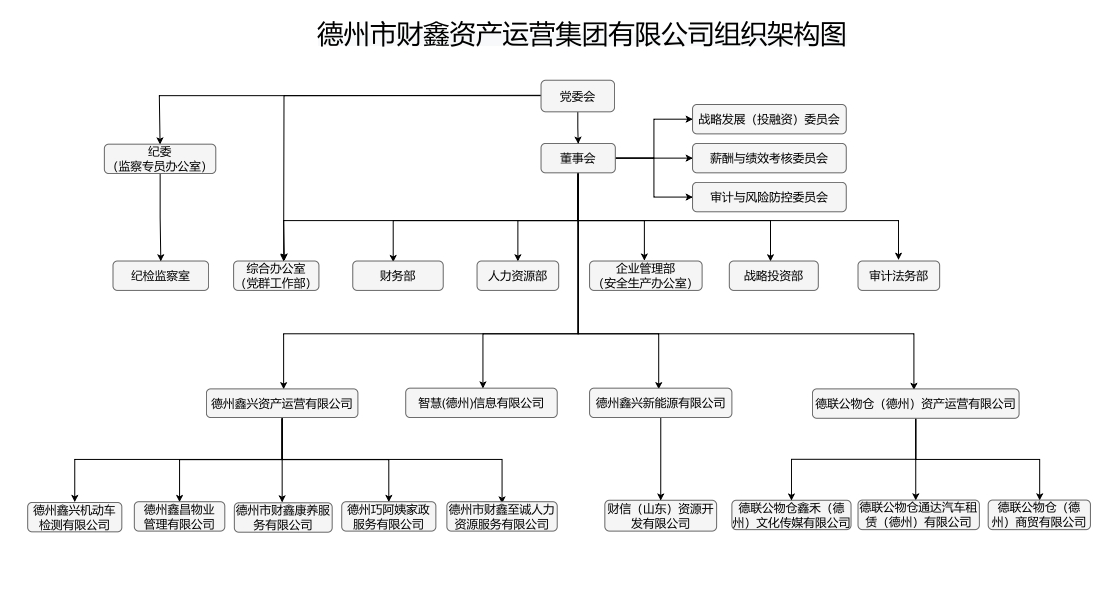 德州市財(cái)鑫集團(tuán)是經(jīng)德州市委、市政府批準(zhǔn)設(shè)立的市屬國(guó)有企業(yè),由德州市財(cái)政局代為履行出資人及監(jiān)管職責(zé),2021年1月注冊(cè)成立,注冊(cè)資本金13300萬(wàn)元。集團(tuán)職能定位為市級(jí)行政事業(yè)性國(guó)有資產(chǎn)統(tǒng)籌盤活的運(yùn)營(yíng)平臺(tái),承擔(dān)國(guó)有資產(chǎn)保值增值職責(zé)。主要功能是:統(tǒng)一管理和市場(chǎng)化運(yùn)營(yíng)納入公司運(yùn)營(yíng)資產(chǎn);受托管理市級(jí)政府公物倉(cāng)資產(chǎn),對(duì)市級(jí)行政事業(yè)單位需要的相關(guān)資產(chǎn)進(jìn)行調(diào)劑配置;在政策允許范圍內(nèi)開展投融資業(yè)務(wù),確??沙掷m(xù)發(fā)展。公司現(xiàn)有職工總數(shù)39人,公司總部設(shè)紀(jì)檢監(jiān)察內(nèi)設(shè)機(jī)構(gòu)和6個(gè)內(nèi)設(shè)部室,下設(shè)4家一級(jí)子公司、9家二級(jí)子公司,實(shí)行扁平式和層級(jí)式相結(jié)合的管控體系。